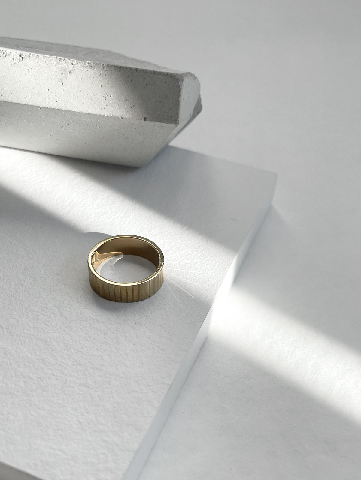 - Minimalist ring with a linear detail of rhythmic cuts.
